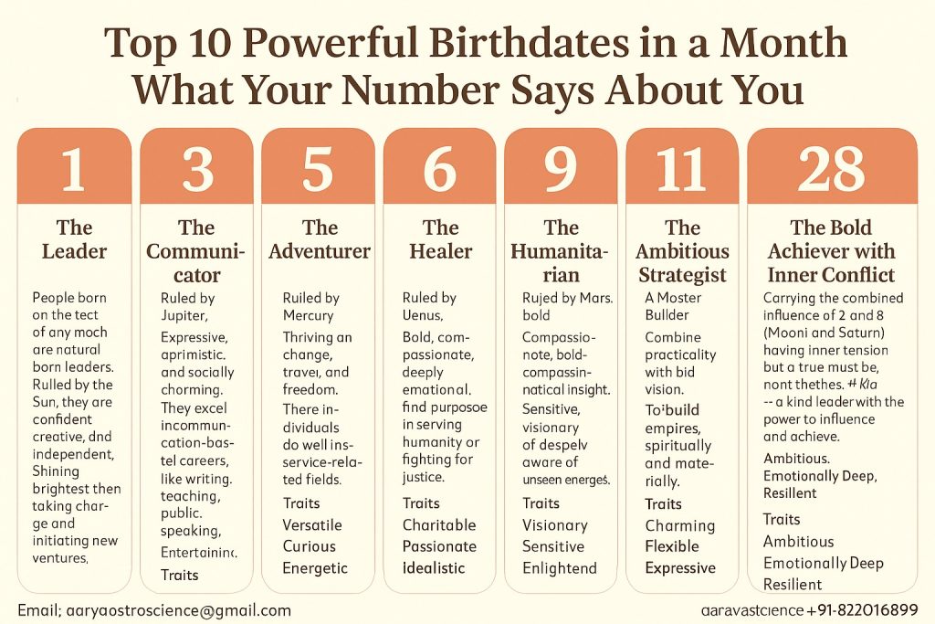 In the world of Numerology, every date carries a vibration, a hidden message about your personality, destiny, strengths, and challenges. While every birthdate has its own significance, certain dates hold especially powerful and magnetic energies. In this master guide, Aaryaastroscience breaks down the top 10 most influential birthday dates in a month and what makes them stand out. Let’s decode the deeper meaning behind the numbers: 1, 3, 5, 6, 9, 11, 17, 22, 23, and 28.