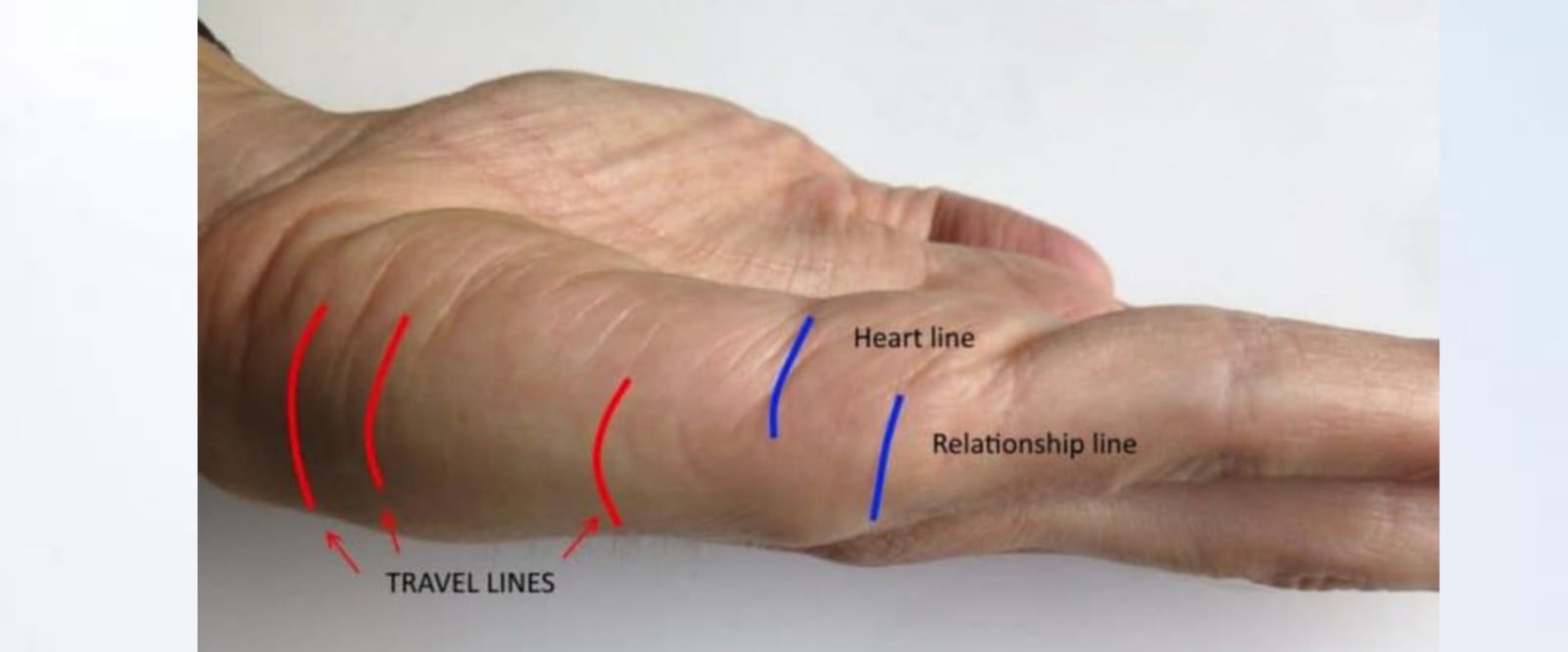 Travel lines are typically found on the Mount of Moon (Luna)—the lower outer edge of the palm, near the wrist and below the little finger. These lines are usually horizontal or slanting and may appear long or short, deep or faint.